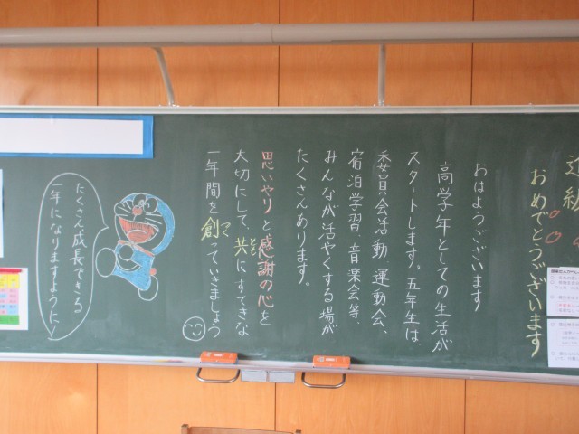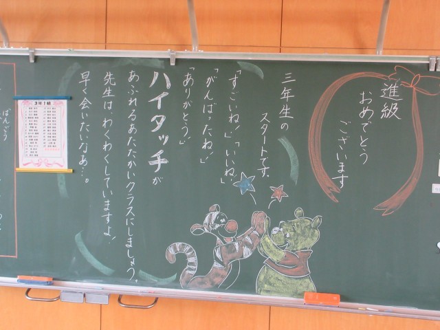 登校前の静かな教室をまわると、子供たちへの黒板メッセージが書いてありました。