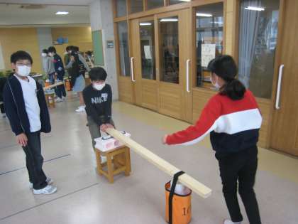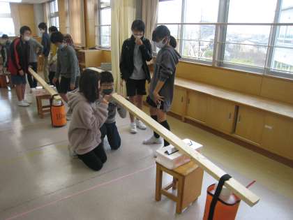 10kgのおもりの位置によって重く感じるかどうかを調べました。いろいろな位置におもりを下げて意欲的に調べていました。