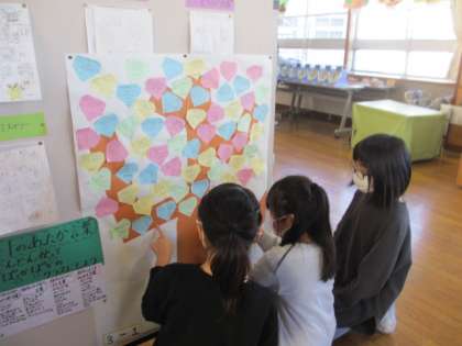各学級でどんな「あったか言葉」があるかを話し合い、友達に「あったか言葉」を言われて嬉しかった出来事をメモに書いて「ポカポカの木」に貼っています。色とりどりの花が咲き、「あったか言葉」が広がっていることがよく分かります。これからも温かい心で周りの人に接することのできる3年生でいたいと思います。