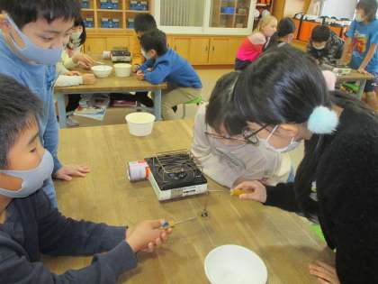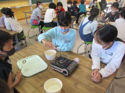 理科「物の体積と温度」の学習で、空気、水、金属をあたためたり、冷やしたりしたときの体積の変化を調べました。金属では、ガスコンロを使って鉄球をあたため、輪の中を通るか確かめました。何もしないときはすっと通っていたのに、熱すると通らなくなったことに驚いていました。みんな目を輝かせ、真剣に実験に取り組んでいました。