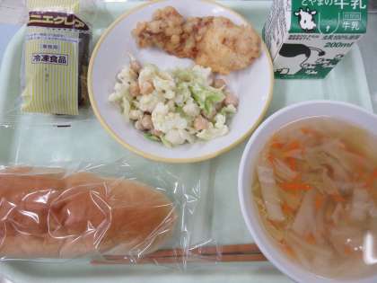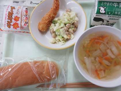 今日の給食は子供たちが楽しみにしているセレクトメニューでした。主菜は豚肉のフリッターとえびフライから、デザートはメープルマフィンとエクレアから、好きな方を選んでいます。どちらも美味しく、大満足でした。