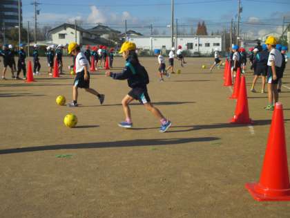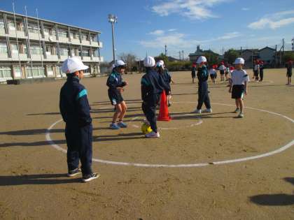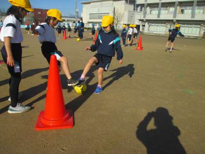 今日は久しぶりに天気がよく、外で体育を行いました。サッカーボールをパスしたり、ドリブルしたりしました。寒さに負けず、元気いっぱいに駆け回る子供たちでした。