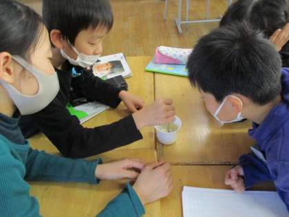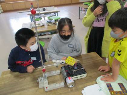 理科「もののあたたまり方」では、空気、水、金属のあたたまり方を学習しています。今回は、金属のあたたまり方を予想して実験しました。金属の温度の変化を表すシールを見つめて、真剣に実験に取り組みました。
