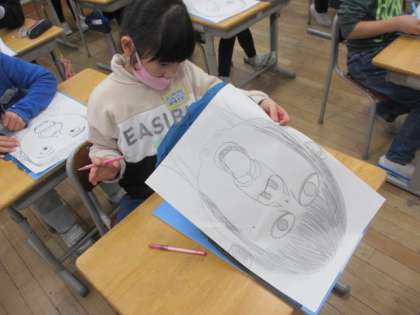 目の輪郭や口の形等、表情豊かな顔を真剣に描いていました。3学期の版画では、彫刻刀を使って板を彫っていきます。完成が楽しみです。