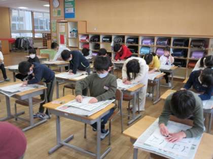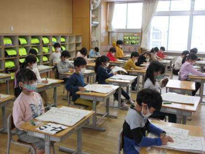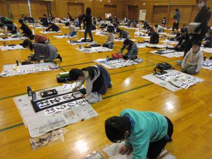 始業式の後、書き初め大会を行いました。1・2年生は各教室で、3〜6年生は体育館で行いました。ピンと張り詰めた空気の中、みんな真剣に取り組んでいました。
