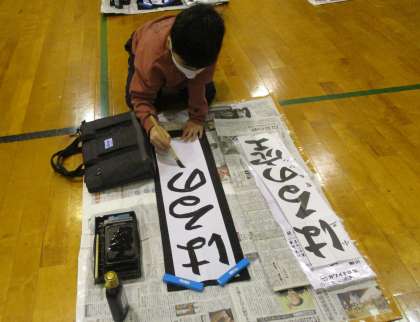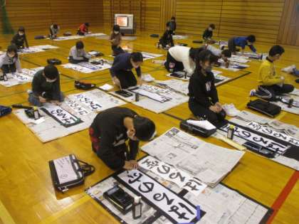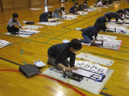 子供たちは、2学期から冬休みの間に練習してきた成果を発揮しようと真剣に取り組んでいました。体育館に入ると静かに準備し、集中して書いていました。