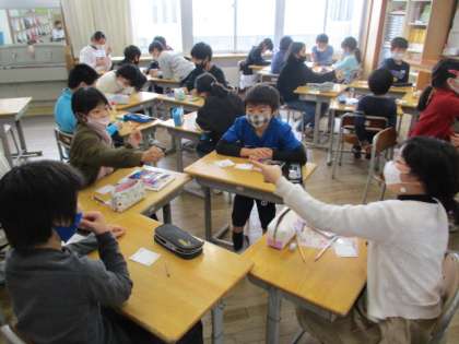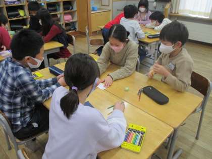 算数科の面積の学習で陣取りゲームを行いました。じゃんけんで勝ったら陣地がとれますが、大きさはばらばら。そのため、同じ大きさのマスで比べる「面積」の考え方を使って順位を決めました。楽しみながら学習に取り組みました。
