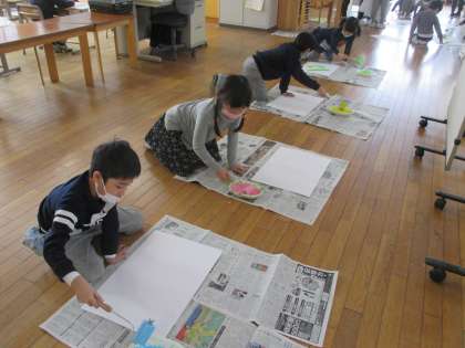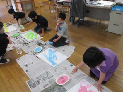 図画工作科の授業で、「たのしく うつして」をしました。ローラーを使って4色の絵の具を重ねる作業では、どんな風に重ねようか悩みながらも、楽しそうに活動していました。どんな作品に仕上がるのか楽しみです。