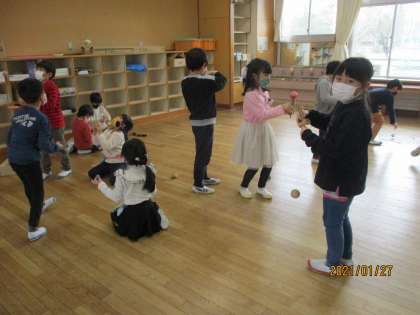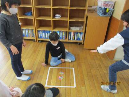 子供たちは、生活科で勉強している「むかしのあそび」に夢中になっています。