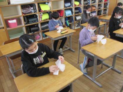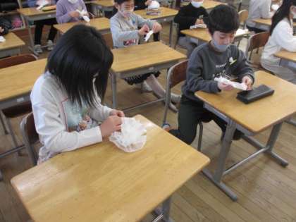 卒業式の飾りに使うお花を作っています。柔らかい紙をそっと折り、優しく花の形に広げていきます。お世話になった6年生さんの顔を思い浮かべながら一つ一つ丁寧に作りたいと思います。