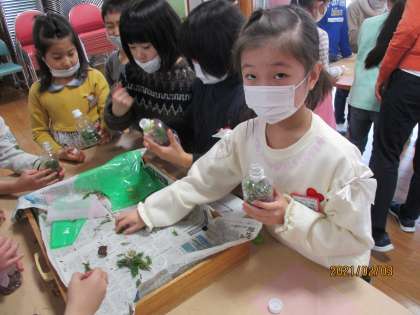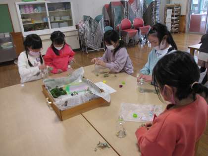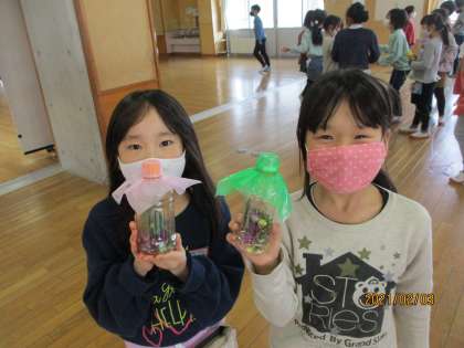 今日ののびのびタイムに、栽培委員会主催のペットボトルフラワー作りが行われました。子供たちは、色とりどりのドライフラワーをペットボトルに詰めて、きれいな作品に仕上げていました。