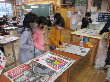 きれいに写っているかなと、おそるおそる紙を持ち上げながら確認する子供たち。