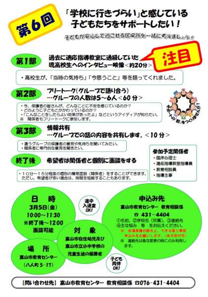 富山市教育センター主催、「第6回『学校に行きづらい』と感じている子どもたちをサポートしたい!」の実施ついてのリーフレットです。