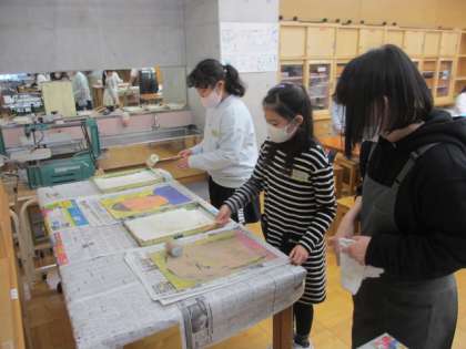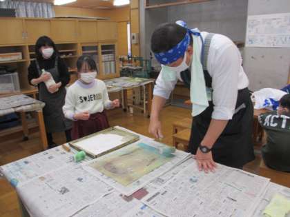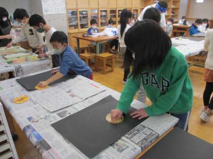 図画工作科では、版画に取り組んでおり、本日はいよいよ紙に刷りました。1回目はお手伝いをしていただき、2回目は自分たちで刷りました。魔法の水を使うと、塗った絵の具が浮き出てくる様子にとても驚いていました。自分でばれんを使って刷る作業では、全体重をかけて力一杯刷っていました。版画の良さがある、良い作品ができましたね。(写真は3年1組のものです)