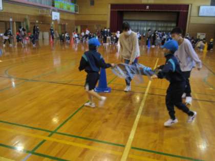 まずは、懐かしい運動会でのペア競技「マンタにのせて」を、体育館バージョンで行いました。