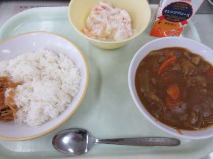 今日の給食は、カレーライス、フルーツヨーグルト、そして、牛乳ではなくオレンジジュースでした。美味しい給食を落ち着いて静かに味わう子供たちでした。