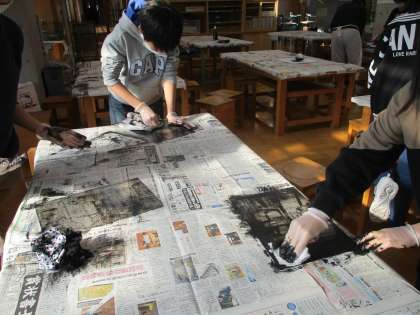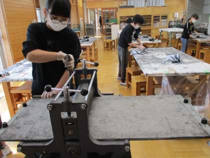 図画工作科「思い出の校舎」では、ドライポイントという技法で凹版画の作品を制作しました。板の削り具合やインクの付け方によって、線の太さや色の濃さ、影の感じが変わり、子供たちは刷り上がった作品を見て、驚いたり喜んだりと様々でした。思い入れのある場所を丁寧に描き、味わい深い作品に仕上がりました。