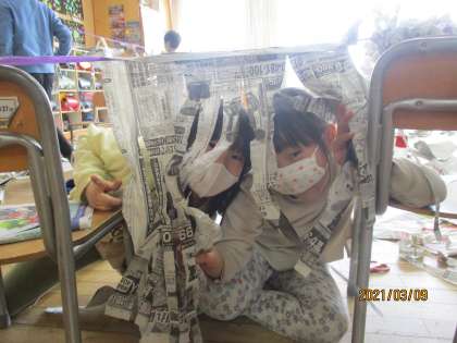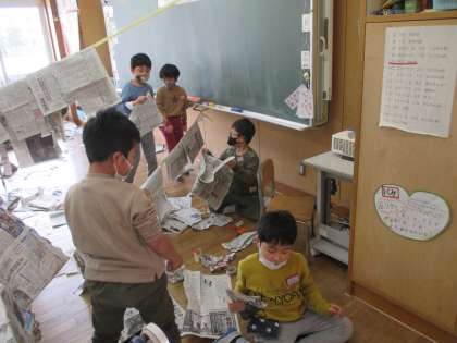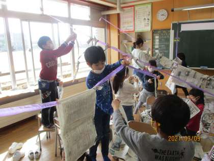 今日の図工の学習は、先週に引き続き、学年全体で行いました。教室に張り巡らせたタフロンテープに新聞紙をつるしてみたり、友達と一緒につなげたりして、楽しく活動しました。