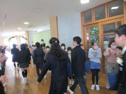 本日は卒業式が体育館で行われ、3年生は教室で卒業式をライブ試聴した後、6年生の教室までを花道を作り、お見送りをしました。式の間は、会場にいる気持ちで背筋を伸ばし聞いていました。門出の言葉に心を打たれ、涙する子供もいました。また、お見送りでは「6年生、今までありがとう」の気持ちを込めて力いっぱい拍手をしてお見送りをしました。かっこいい6年生の姿を見届けることができてよかったですね。