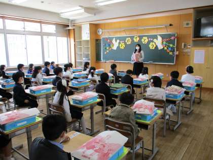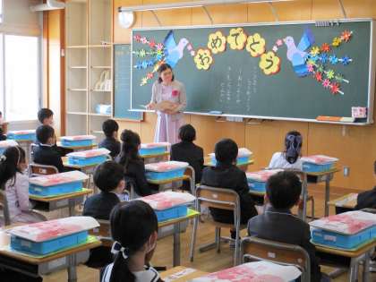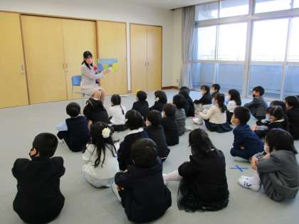 本日はご入学おめでとうございます。少し緊張していた子供たちだと思いますが、式では元気いっぱい挨拶をしたり、最後までしっかりと話を聞いたりしていました。教室でも先生と目をつないで話を聞いたり、高く手を挙げて返事をしたりする姿がありました。さすが光陽っ子の1年生です。