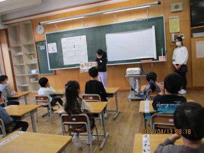 入学式の次の日から、6年生さんが朝の準備を手伝ってくれています。ランドセルのしまい方、提出物の出し方、トイレの補助などをしてくれています。とても頼りになります。準備がだいたい終わった頃をみはからって、読み聞かせをしてくれています。