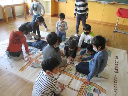 2002年に作られた、光陽校区の地図です。登校した子供たちは「何〜?これ?大きいなあ」とびっくり。「小学校がここなら、ぼくんちはこの辺かな」「神通川がすごく大きい!」と、興味津々です。