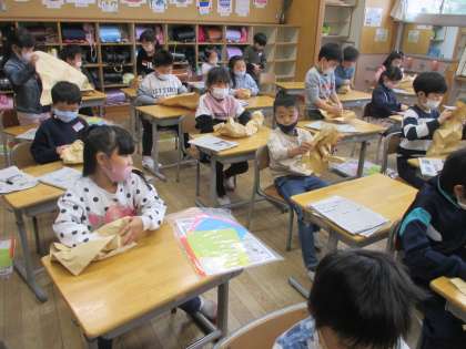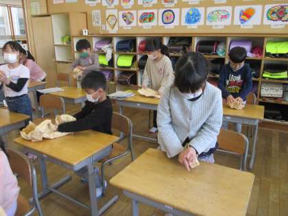 図画工作科の学習「ぐしゃぐしゃぎゅ」が始まりました。紙袋をぐしゃぐしゃにつぶして、丸めて、柔らかくほぐして、その中に、新聞紙をつめて。