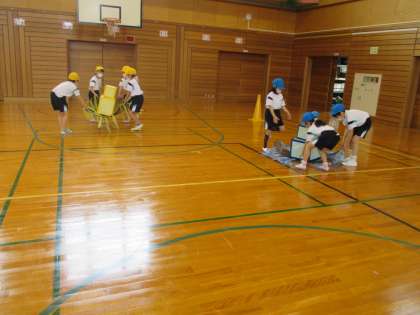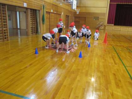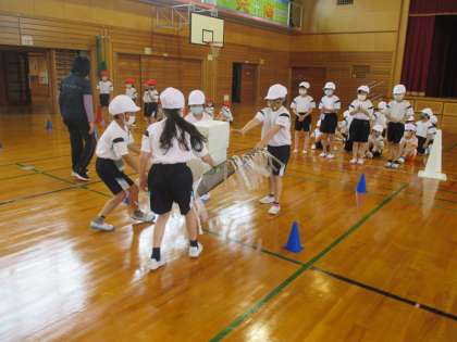 4人で息を合わせ、バランスをとりながら二つの箱を運びますが、これがなかなか難しいようです。それでも、「せーの」「がんばるよ」「もう少しもう少し」とお互いに声を掛け合いながら、ゴールにたどり着くことができました。仲間を応援する姿、待つときの態度もとても素晴らしかったです。次は、どのように工夫して運べばよいのか、チームで工夫して練習に取り組みましょうね。
