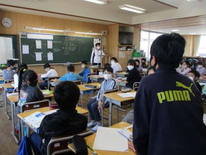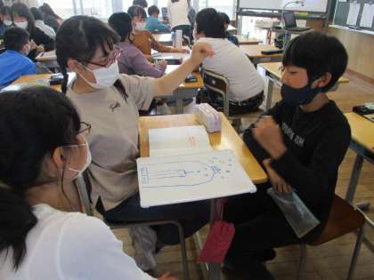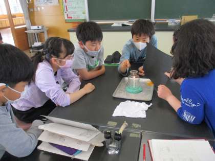 集気びんの中にあるろうそくを燃やし続けるには、どのようにすればよいか、予想を立て、実験し、確かめています。目には見えない空気がどのようになっているのか、図を書いたり、生活経験と結び付けたりしながら考え、理解を深めています。