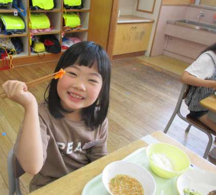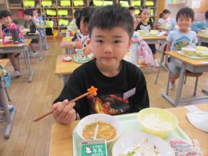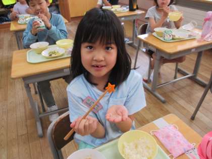 本日の給食にも、やったあ!ラッキーにんじんがありました。「先生!ラッキーにんじんがあったよ」と嬉しそうに教えてくれました。また、本日の給食には「運動会頑張ろうデザート」ということで、嬉しい嬉しいガトーショコラがありました。きれいに食べている子もいれば、口の周りにチョコを付けている子もいましたが、どの子もおいしそうに食べていましたよ。