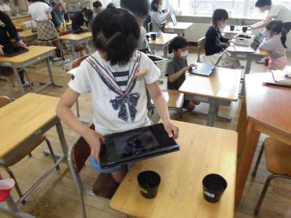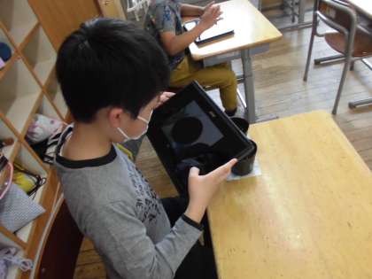 Chromebookを使って学級で育てているホウセンカとひまわりを写真に撮って記録しています。芽が出てきた子供たちもいて、成長する様子を楽しく観察しています。