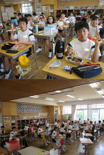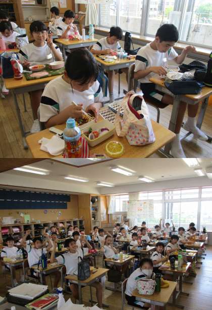 待ちに待ったお弁当タイムです。「お腹ぺこぺこ〜」と言いながら校内に入ってきた子供たち。美味しくいただきました。保護者の皆様、お弁当の準備ありがとうございました。
