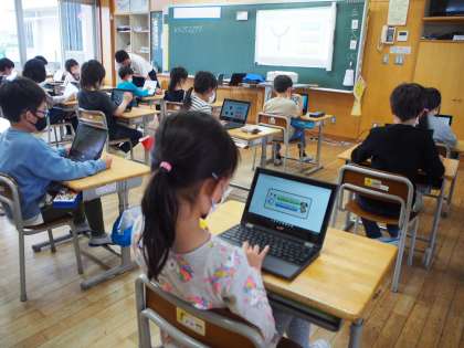 よく話を聞き、学習に取り組んでいます。コンピューターを使って地図記号について学ぶ時間に、分からないことを互いに教え合う姿がありました。前向きに取り組む3年生です。