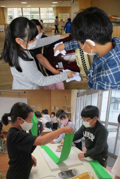 片付けも最後まで取り組みました。太鼓の砂を落としたり、たすきにアイロンをかけたりして、来年の6年生が気持ちよく使えるようにしました。