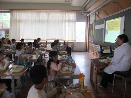 本日の給食では、1組に栄養職員の先生から、学校の給食についてのお話がありました。お話を聞いた後、早速給食室に向かって「おいしかったです。ありがとう。」と言っている子もいました。おいしい給食の秘密を聞いて、より一層、感謝して食べる1年生でした。