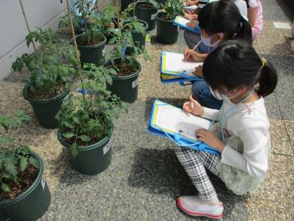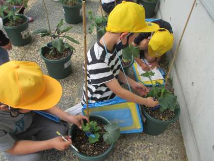 今日は、自分の野菜をじっくり観察しました。「大きくなったけれど、葉っぱが虫に食べられているよ」「大きくなって野菜が倒れてきそうだぞ」と、新しい課題も出てきました。