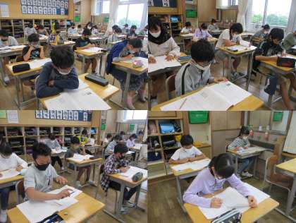 本日、「全国学力・学習状況調査」が行われました。子供たちは、これまでに学習したことを思い出し、時間いっぱい、よく考えて問題に取り組んでいました。