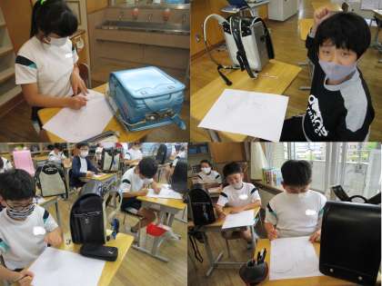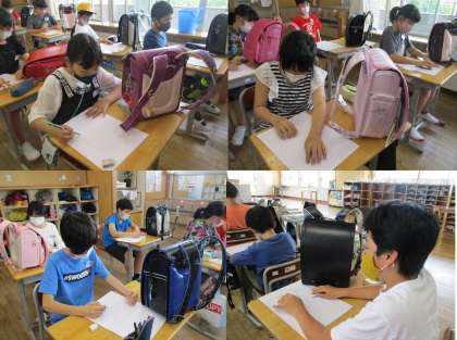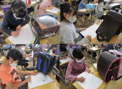 6年間、一緒に登校してきたランドセル。たくさんの思い出が詰まったランドセルを、水彩で描きます。まずは、下絵です。縫い目や傷もよく見て、丁寧に描いています。