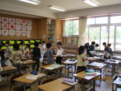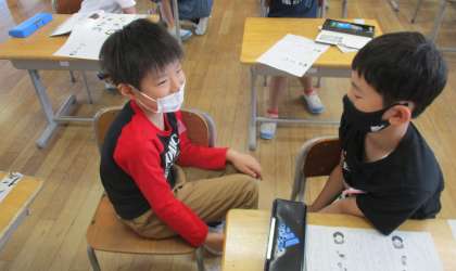 生活科で植えている朝顔にも毎日コツコツと水をあげている1年生です。写真は、国語科「わけを はなそう」、生活科「がっこうたんけん インタビュー」の様子です。どの学習にも一生懸命取り組んでいます。暑い日が続きますが、水分をしっかりとりながら頑張りましょう。
