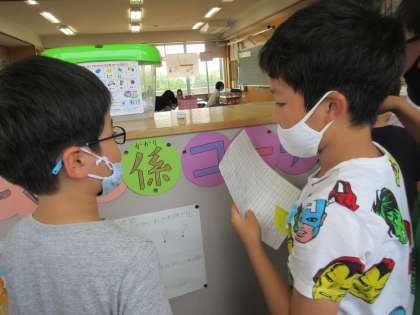 水曜日の昼休みは、12時50分から13時25分までの「のびのびタイム」です。給食後、自分のしたいことをたっぷりと行うことができる楽しみな時間です。3年生のコーナーは、笑い声があふれていました。クラスみんなでフルーツバスケットをしたり、クロムブックで友達とお話づくりの続きを楽しんだり、係のコーナーでクイズを出し合ったりしていました。友達と関わり合いながら、夢中で遊ぶ元気な3年生でした。