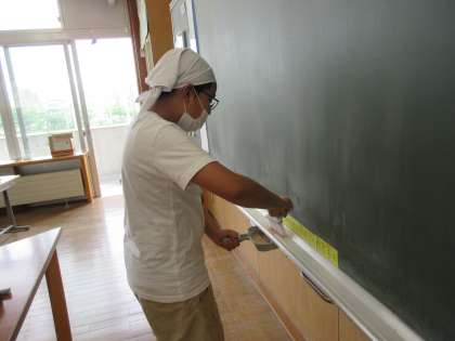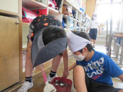 昨日は「のびのびタイム」で清掃活動がなかった分、今日はたくさん埃が取れましたね。4年生は、みんなで力を合わせ、すみずみまで掃除をしていました。ほうき担当もから拭き担当も、うっすら汗をにじませながらがんばっています。チョークの粉も丁寧に集め、洗面所の鏡も細かく磨き、仕上げのちりとりもねばり強く行っていました。昨日は元気に過ごした「のびのびタイム」でしたが、今日は、落ち着いて清掃活動。校内放送の「白鳥の湖」を聞きながら。