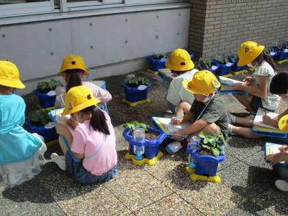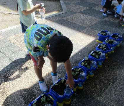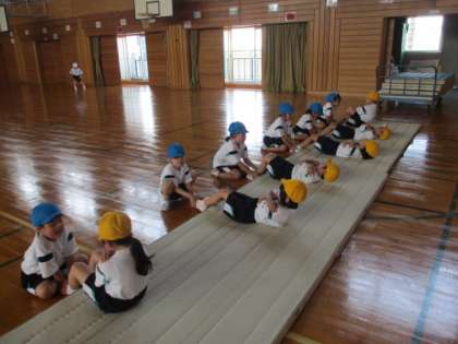 毎日、朝顔のお世話を行い、自分の朝顔をよくよく観察をしています。体育ではスポーツテストを行っています。写真は、上体起こしをしている様子です。