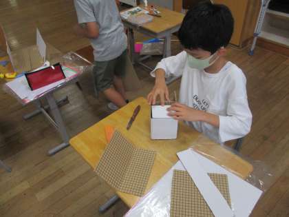 段ボールで小物入れや引き出しケース等を作っています。段ボールカッターで丁寧に部品を切ったり、木工用ボンドでしっかりと接着したりして丈夫な作品にしようとしています。どのような段ボールボックスになるのか楽しみです。