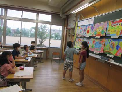 2組は、図画工作科の学習をしています。「ふしぎなたまご」の友達の作品について、どうやって素敵な色を作ったのか、描いた友達から真剣に話を聞いています。