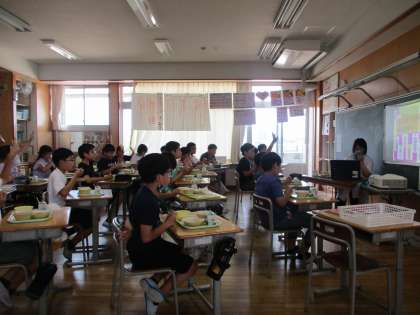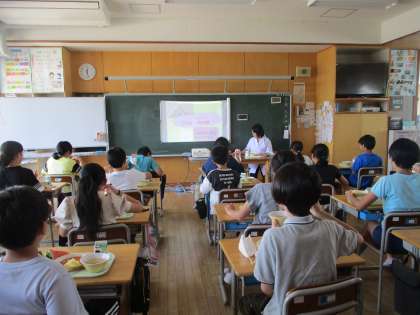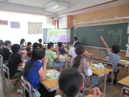 給食の時間に、栄養職員より、パワーポイントを使って食事に関するお話がありました。