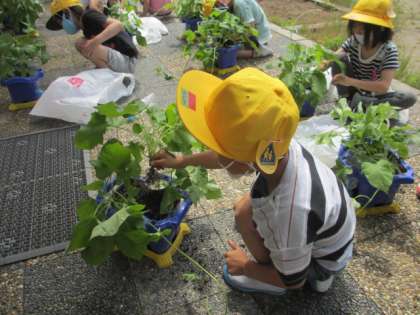 1年生のあさがおが、ぐんぐん成長しているので、間引きをしました。どのあさがおにもたくさん栄養がいくよう、自分の鉢には2、3残し、残りはお家に持ち帰りました。葉も大きくなり、高さも高くなってきたあさがおですので、支柱も立てました。
