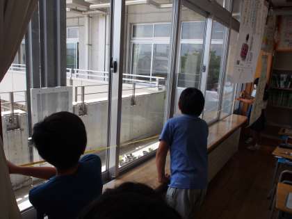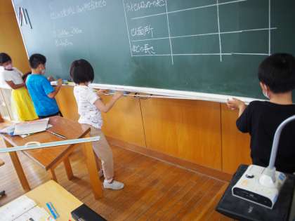 算数科の学習で巻き尺を使って物の長さを測る学習をしています。どうしたら正確に測ることができるのか考え、0cmにしっかり合わせて真っ直ぐに測ることができるように協力しました。