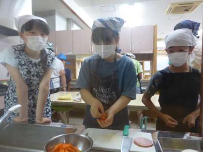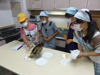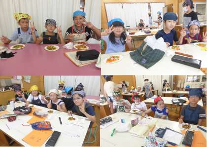 子供たちが楽しみにしていた調理実習を行いました。今回作ったのは、朝食にぴったりの「いろどりいため」です!にんじんとピーマン、玉ねぎ、ハムを入れました。手順を考え、安全に気を付けて、美味しい「いろどりいため」を作ることができました!写真は1組です。
