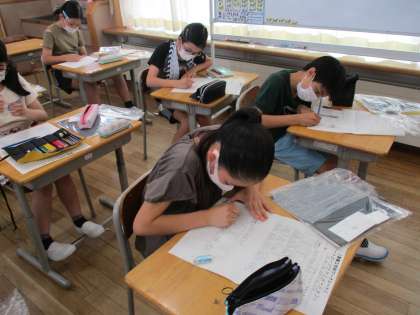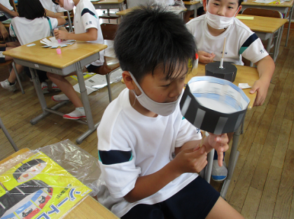 図画工作科では、ゾートロープ(10コマの回転のぞき絵)を作っています。10枚が繋がるように、動かしたいものの形を一生懸命考えながら絵を描いています。