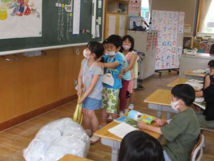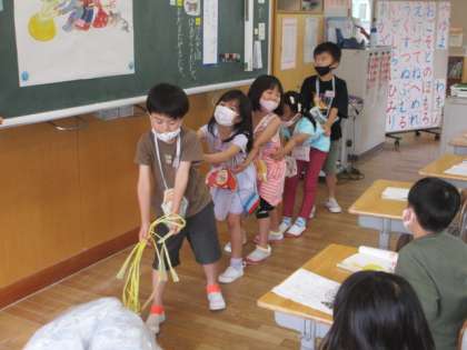 国語科では、「おおきなかぶ」を勉強しています。おじいさんから始まって、おばあさん、孫、犬、猫、ネズミと、どんどん引っ張る人が増えていくのが楽しく、子供たちも大好きです。写真は、1組の子供たちが、おじいさん達登場人物の役になってかぶをひっぱっているところです。「つかれた!」「どうしてぬけないんだろう」と、おじいさん達になりきって、思いを語っていました。